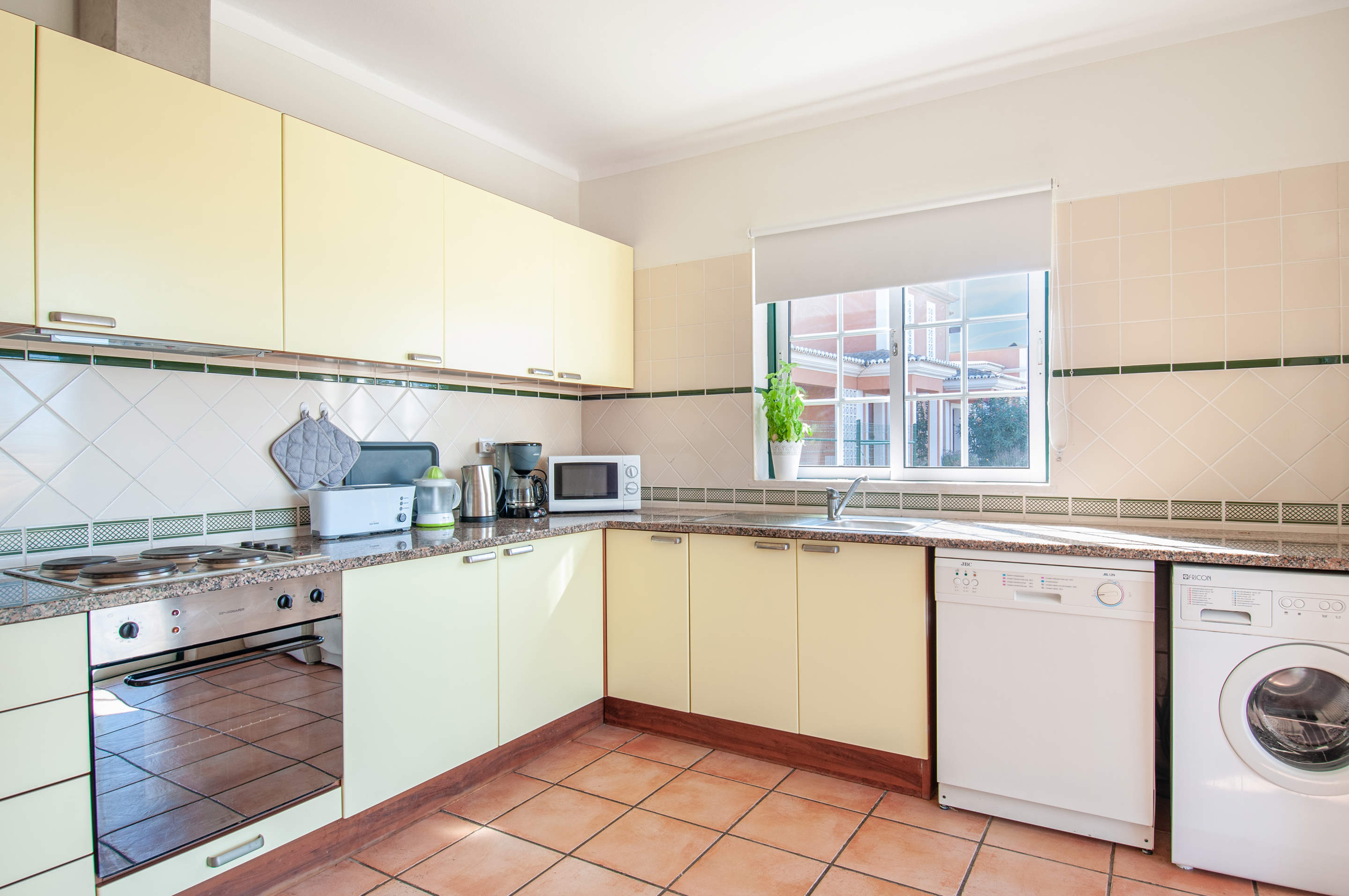 Fully equipped kitchen with appliances including electric hobs, oven, toaster, juicer, kettle, coffee maker, microwave, fridge freezer, dishwasher, washing machine and iron & ironing board.