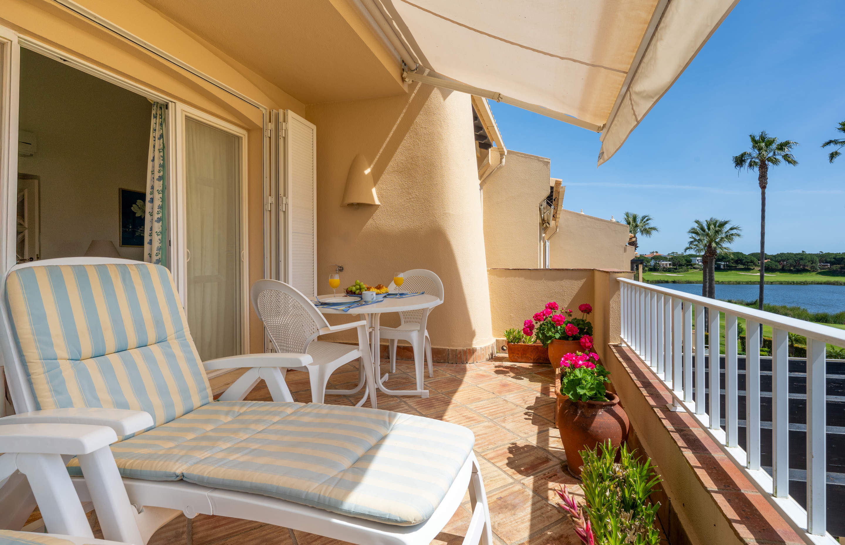 This second floor apartment is accessed via a flight of steps. The resort's wi-fi internet connection is provided free of charge throughout your stay. With sweeping views of the lush golf course and serene lake, this apartment offers an exceptional blend of comfort, style, and tranquility. The bright, open-plan living space is flooded with natural light through expansive sliding glass doors, seamlessly connecting the fully equipped kitchen with the inviting lounge/ dining area which is complete with a flat screen TV, comfortable sofa and chairs and a private balcony, ideal for al-fresco dining or simply soaking up the peaceful scenery.