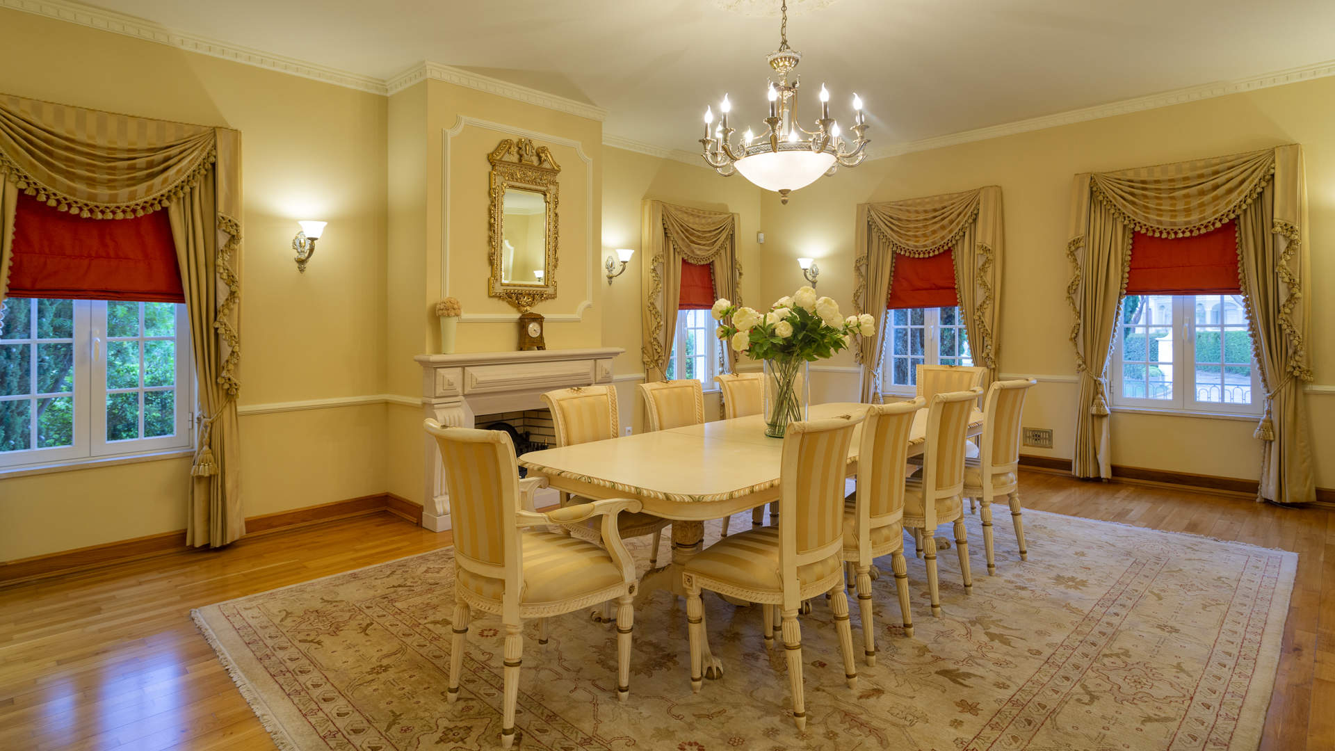 The beautiful formal dining room off the hall has a large table and chairs for up to 10 persons, its own fireplace and built in display cabinet.