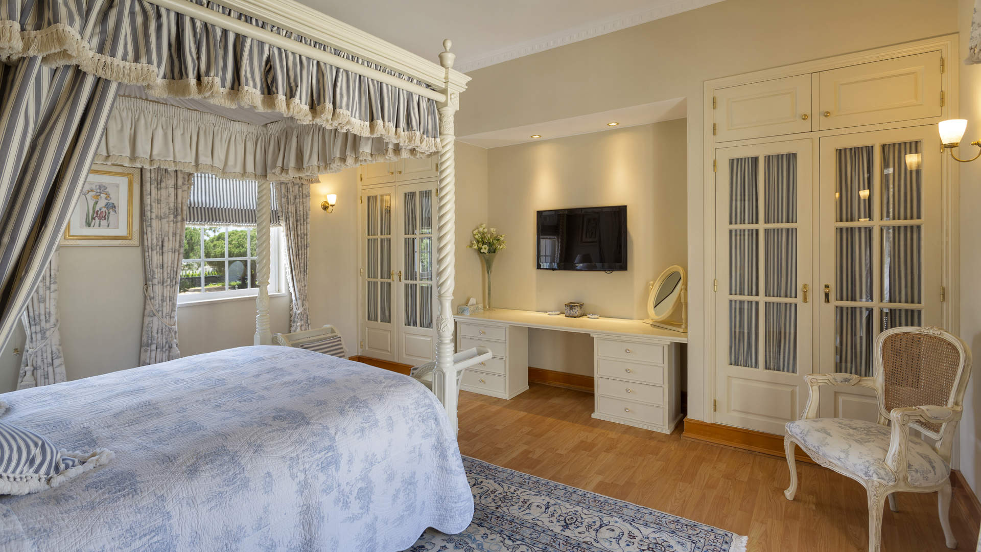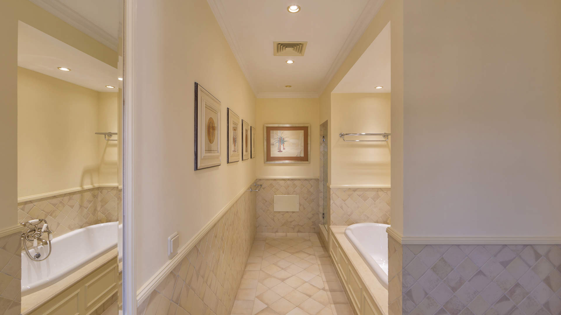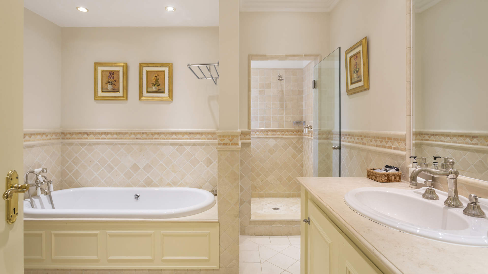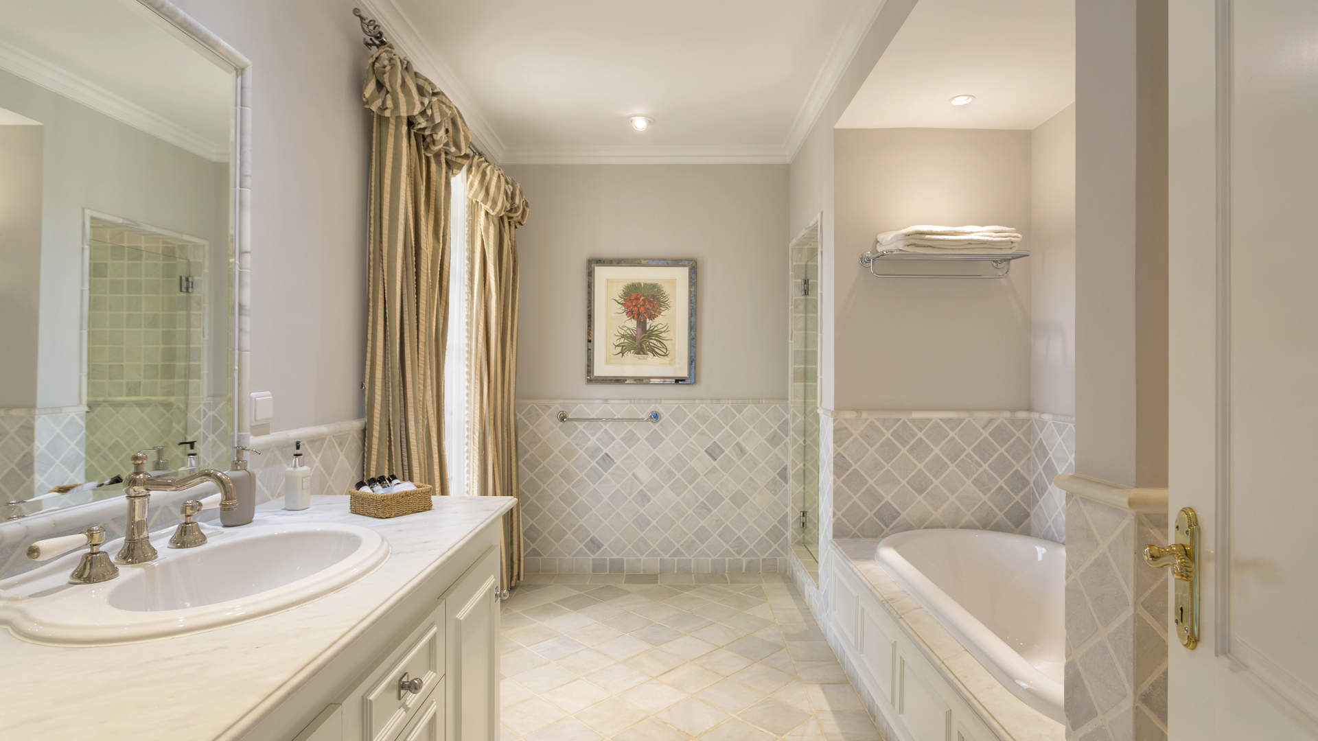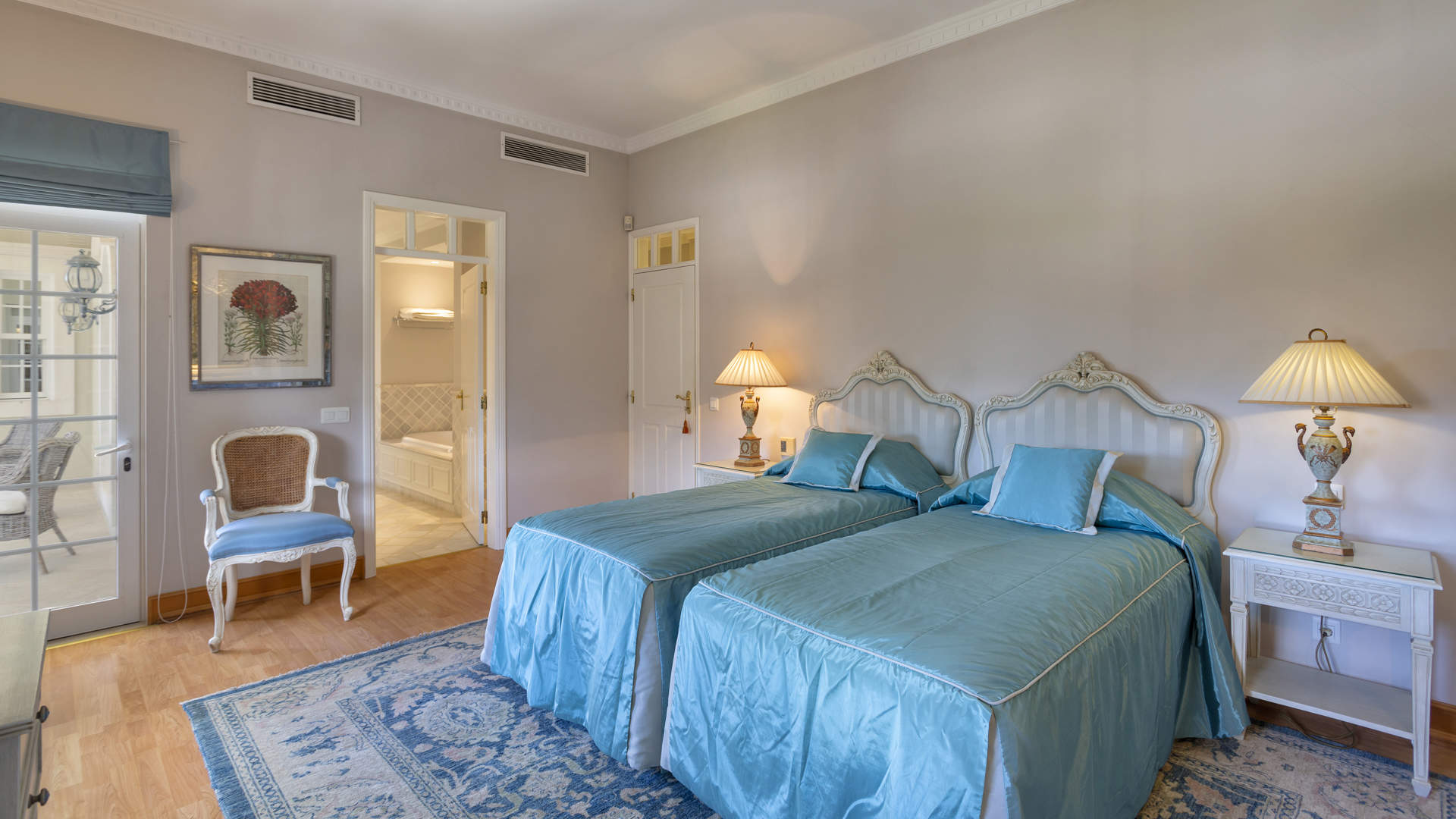 The villa has four bedrooms, all approximately the same size, one on the ground floor and three on the first floor each with double built in wardrobes and its own en-suite bathroom with bath and separate shower cubicle. Each bedroom, which is fully air-conditioned, has a dressing table and a flat screen smart TV, and those bedrooms on the first floor have access to their own balcony. All have twin beds, except the master bedroom which boasts a four-poster double bed. Twin bed measurements are 2.00 metres x 0.95 metres. Double bed measurement is 2.00 metres x 1.60 metres. One of the twin bedrooms on the first floor can also be prepared as a double bed upon prior request and with confirmation from the owner. Laundry baskets and hair dryers are provided in each bedroom and there is a safe in the master bedroom. There is an additional separate toilet and shower room on the ground floor for visitors.