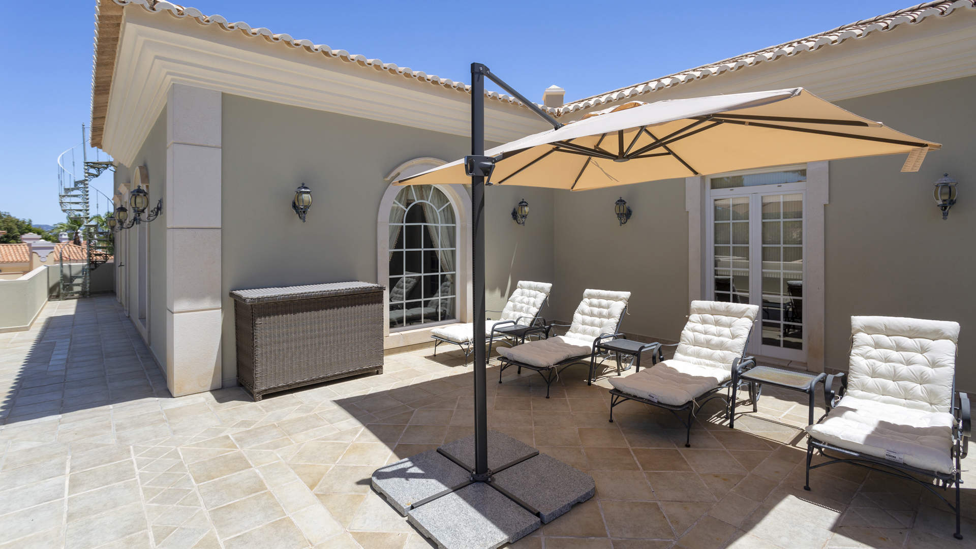 The large first floor terrace outside the master bedroom has 4 more cushioned metal sun loungers, a large sunshade and a bar. A spiral staircase from the first-floor terrace leads to a roof terrace, which has 360-degree views of the sea and mountains.