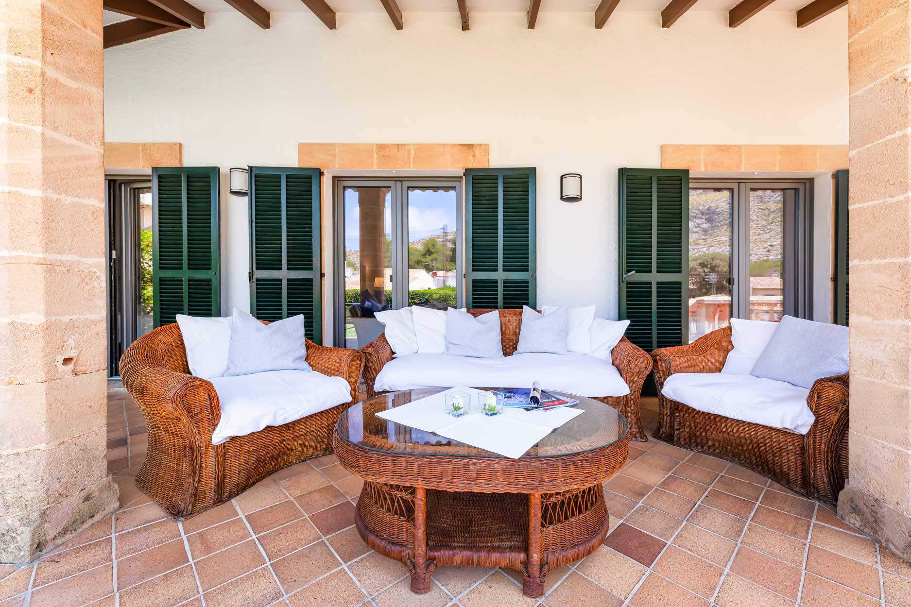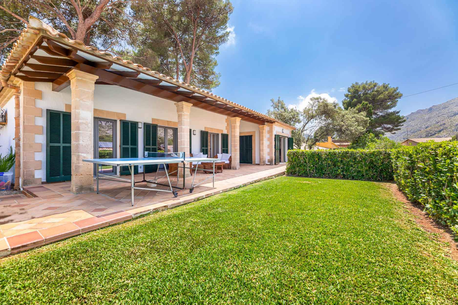 Front covered terrace with a comfy rattan suite & table tennis table.